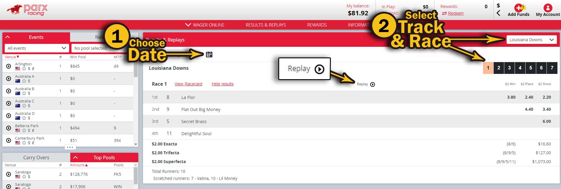 Using the Bet Pad, choose the track name then race number from the race selector. The results for that race will appear on the Bet Pad. Replay is available if you see