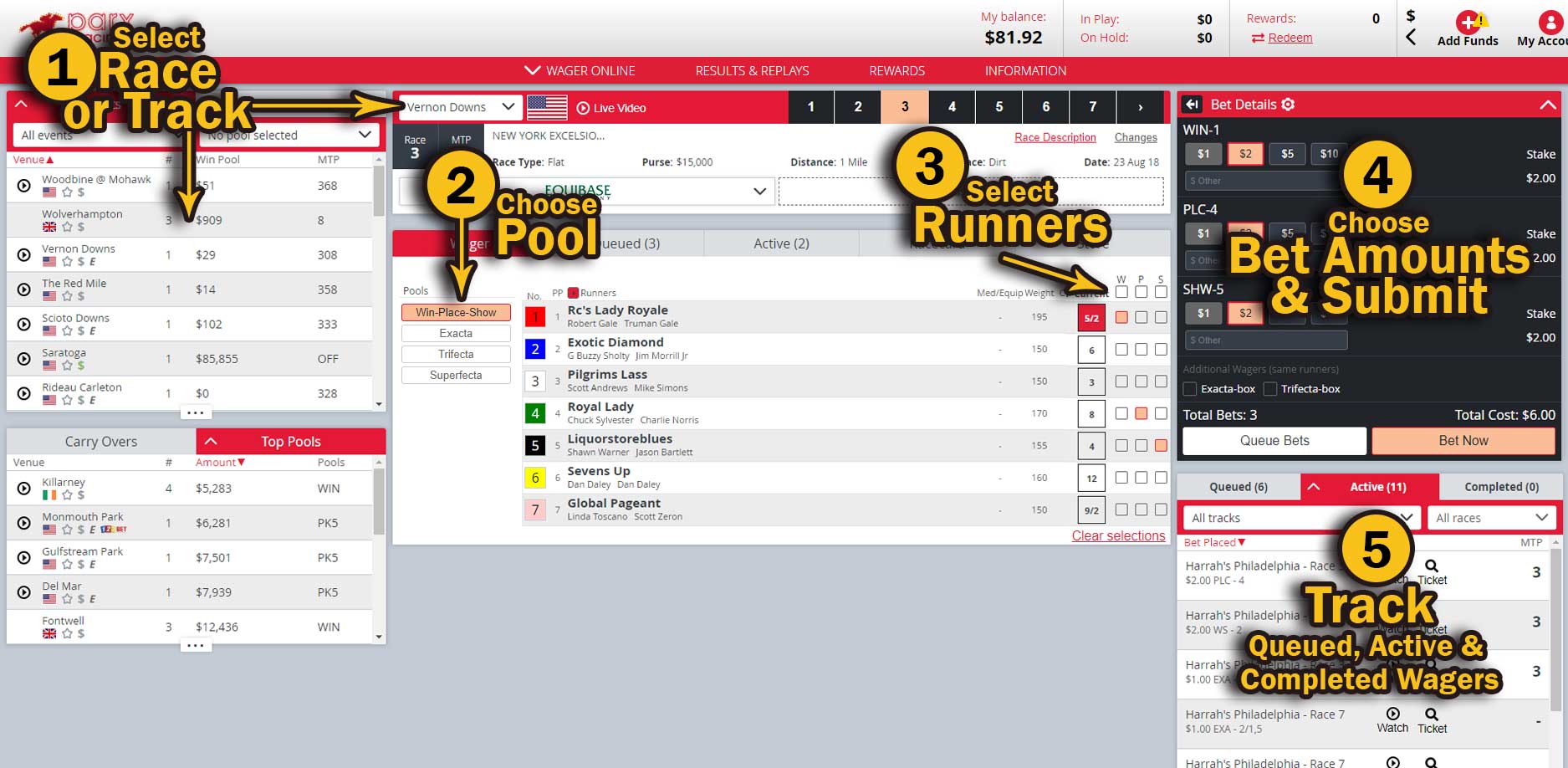 Select your race, choose your pool, select your runners, choose your wager amounts then place your wager. You can also queue wagers to be submitted later.
